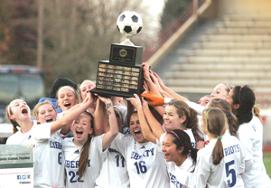 Team Trophy Published November 15, 2015 at 300 × 208 in Pronouns By Greg Farrar The Liberty High School girls soccer team exults with the state 3A championship trophy Nov. 23 after beating the Kamiakin Braves, 2-1, in Puyallup.